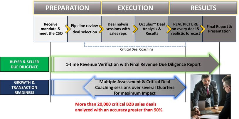Occulus™, our proprietary, AI-based critical deal analysis platform is the core of the Revenue Verification Process solution for buyer and seller due diligence.